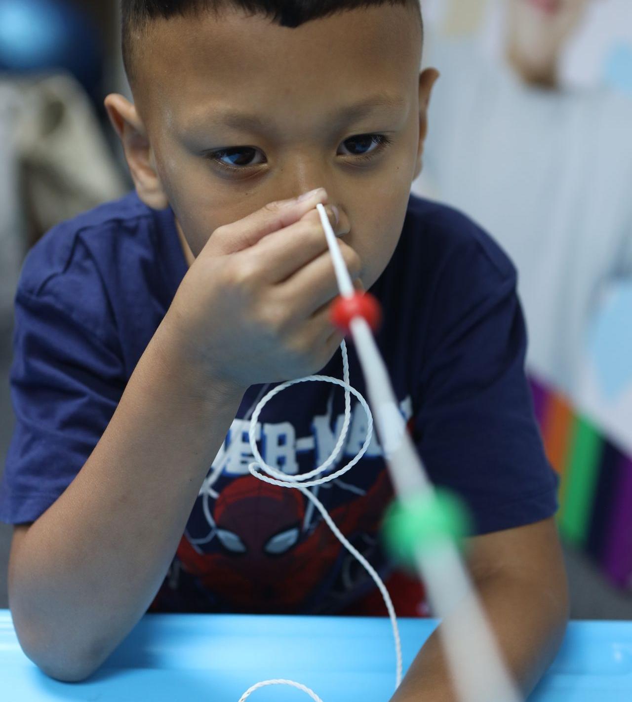 A great activity for visual tracking, hand-eye coordination and saccadic eye movements. With used toilet rolls and a shoelace, first ask your child to thread the shoe lace, as shown in the picture. Then have them pull one end and follow the shoelace with their eyes as it unravels itself.
